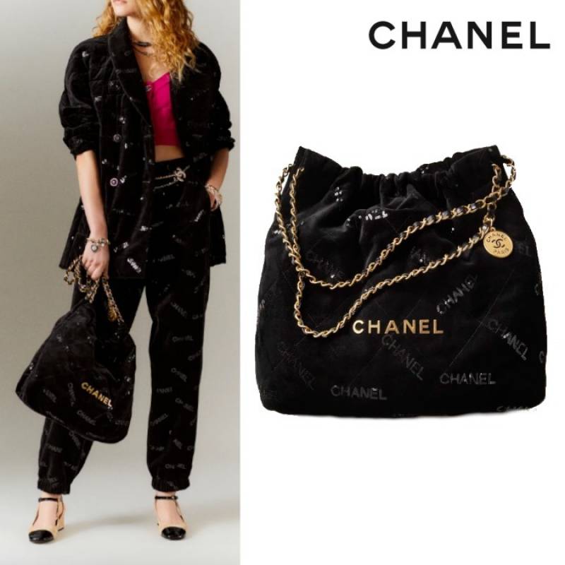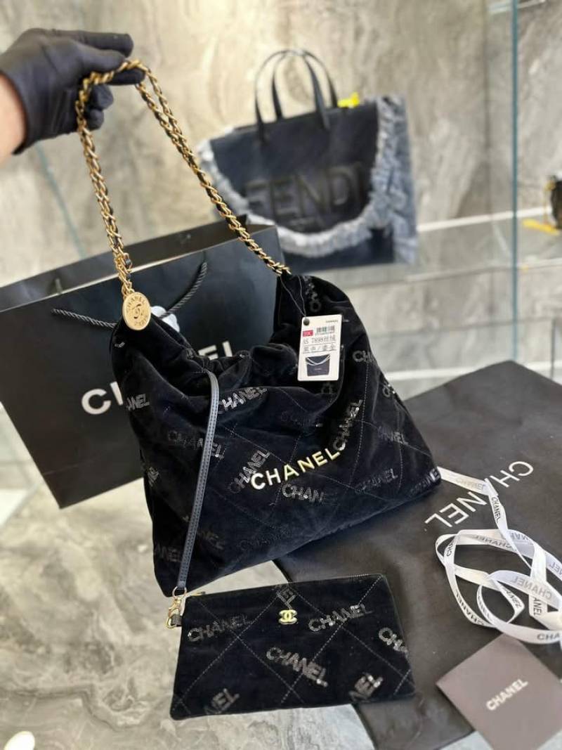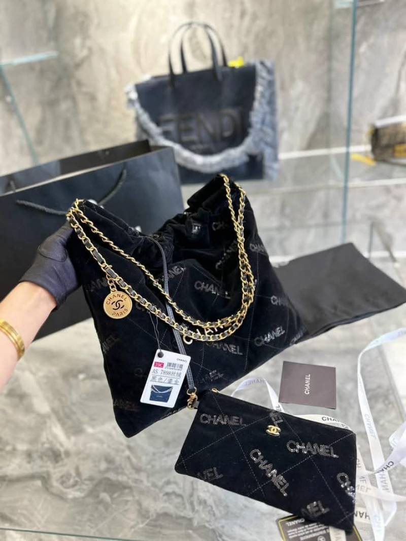 Chanel_ 22 small bag in black quilted velvet Bag with Dust Cover premium quality
