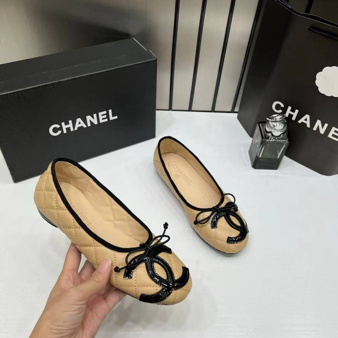 Chanel_Quilted_Cambon_Leather_Ballet_Flats_In_Apricot_Beige_Black_Toe_Bow_With_OG_Box_&_Carry_Bag