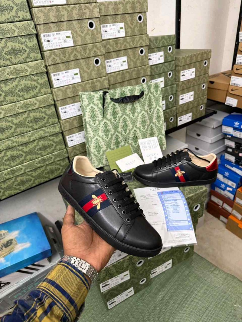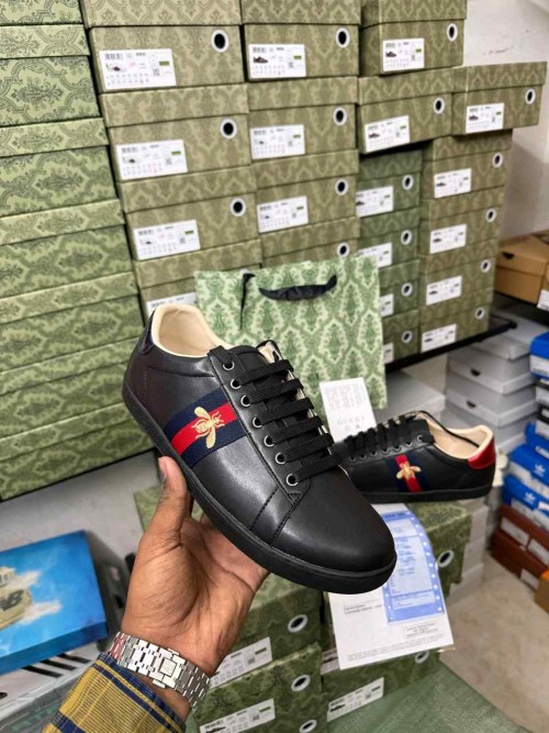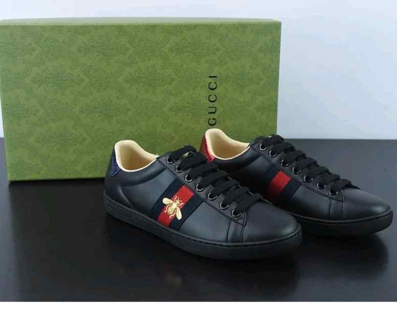 Guccii Black Leather Ace Embroidered Bee Low 406