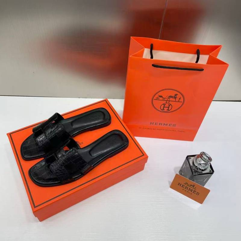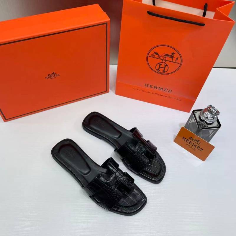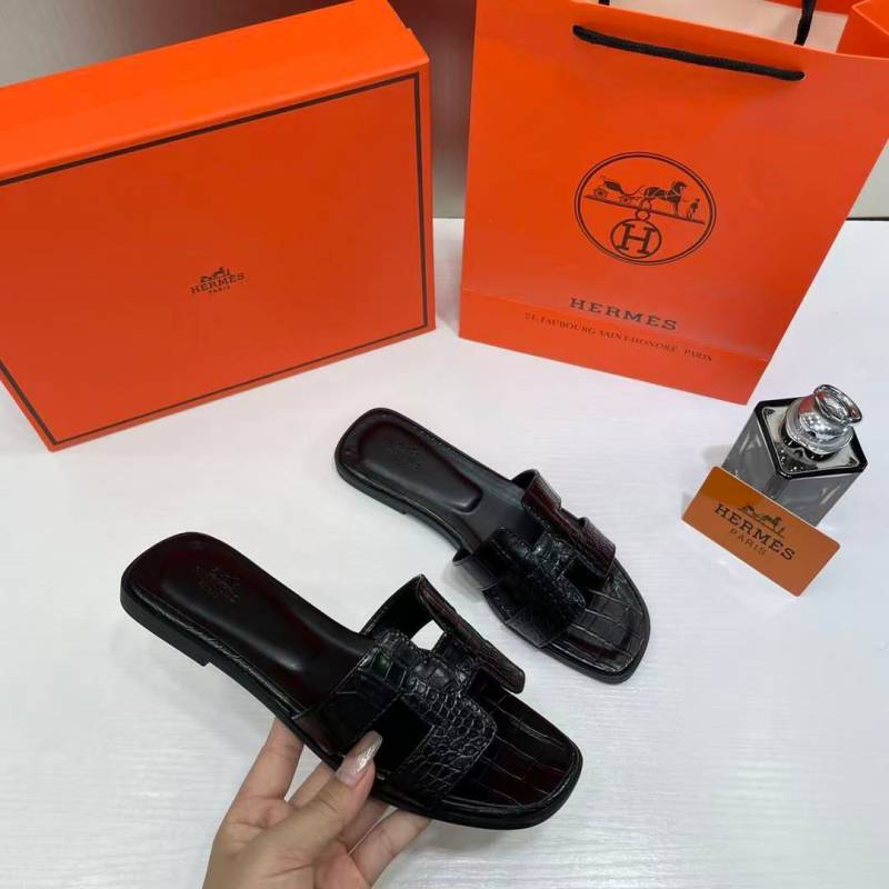 Hermes Paris Oran Flats Croc Leather Black For Her With OG Box & Carry Bag Black Slide H-38