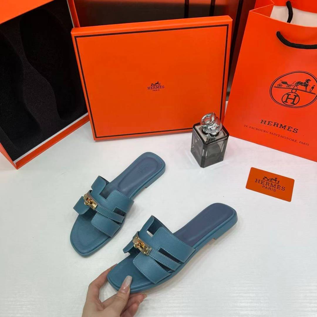 Hermes Paris Oran Flats For Her With OG Box & Carry Bag H38-41 Blue Jean Slide