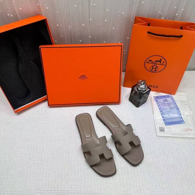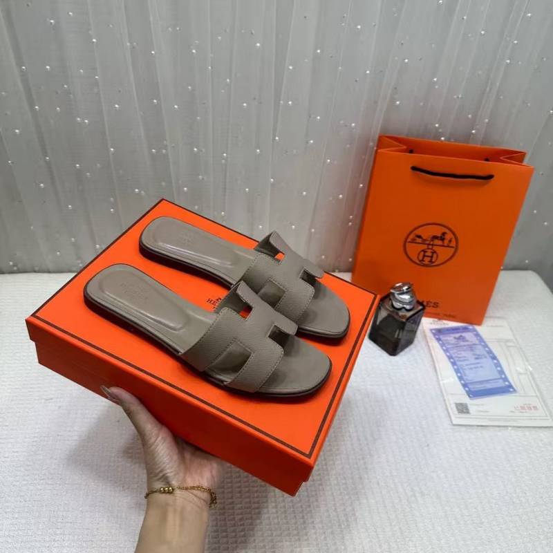Hermes Paris Oran Flats For Her With OG Box & Carry Bag Taupe Brown Slide H38